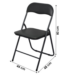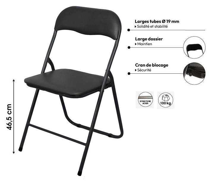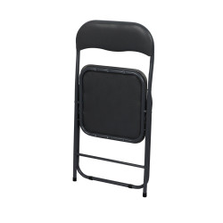Description d'une chaise : Chaise pliable structure solide en acier et revêtement dossier et assise en PVC.